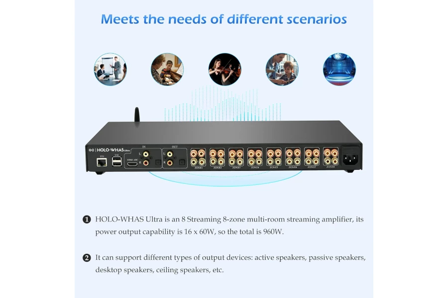 HOLOWHAS Ultra is an 8 Streaming 8-zone multi-room streaming amplifier, its power output capability is 16 x 60W, so the total is 960W. It is an ideal solution for distributing HiFi audio to different rooms or zones within the whole house or building with pre-wired speakers. This allows you to play different audio sources in different areas or synchronize the playback for a consistent listening experience throughout.