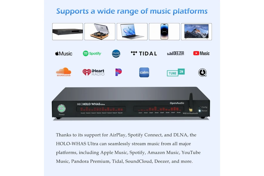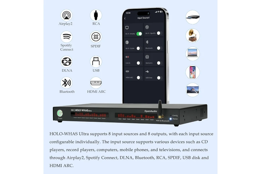 This amplifier has 8 different input source options to play music to 8 zones. You can use any combination of 8 input sources to play music to any combination of 8 zones. The user can select from 8 available streaming options, namely Qobuz Connect, Airplay2, Spotify Connect, DLNA, Bluetooth, RCA, SPDIF, USB disk and HDMI ARC (Qobuz Connect, Airplay2, Spotify Connect, DLNA can be initialized 8 times, but Bluetooth, RCA, SPDIF, USB disk and HDMI ARC can only be initialized once). All of the above functions can be controlled using the HoloHome mobile application available.