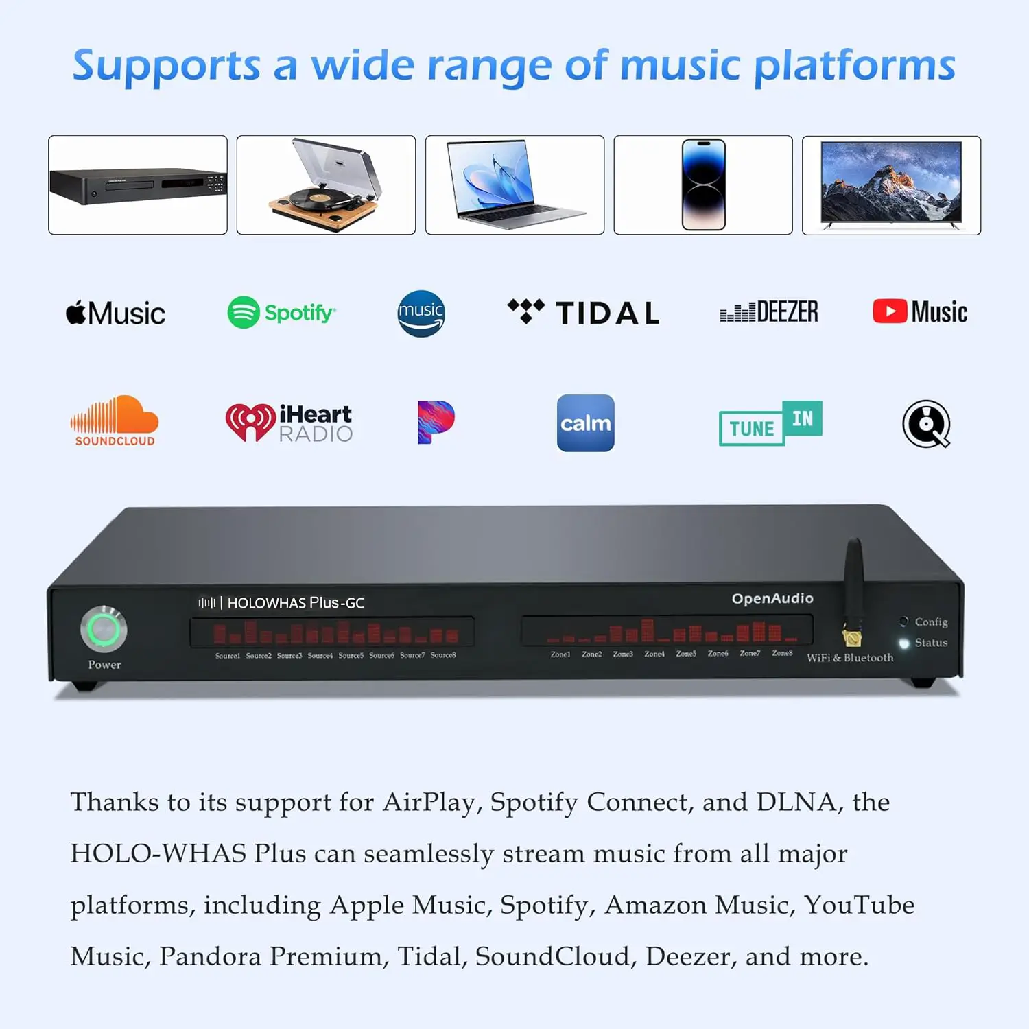 - Simple Audio Source Switching: Clear interface for intuitive selection and switching between different audio sources like Google Cast, Qobuz Connect, Airplay2, Spotify, DLNA, Spotify Connect, Bluetooth, HDMI ARC, Line In and Spdif, etc.